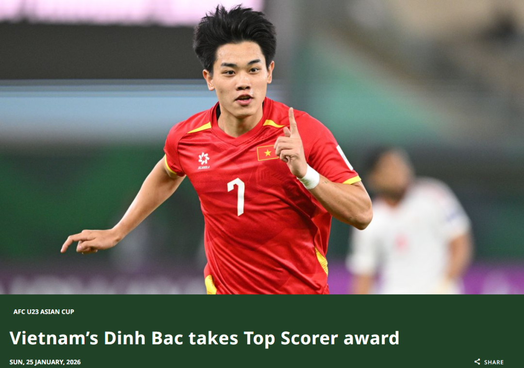 北京时间1月26日,亚足联正式公布本届U23亚洲杯的最佳射手评选结果。与评选最佳门将不同的是,亚足联这一次采取了更为人性化的评选方式,综合球员的个人数据以及专家的投票,最终获得最佳射手的球员,并不是来自日本队的佐藤龙之介,而是越南队前锋阮庭北。