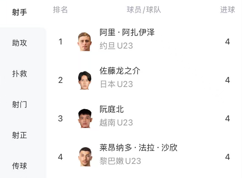 在U23亚洲杯的射手榜上,一共有4人打进4球,分别是约旦队的阿里.阿扎伊泽,日本队的佐藤龙之介,越南队的阮庭北,黎巴嫩队的莱昂纳多.法拉.沙欣。而中国队进球最多的球员是彭啸,他打进2球。因此,中国队无人进入最佳射手球员评选范围。